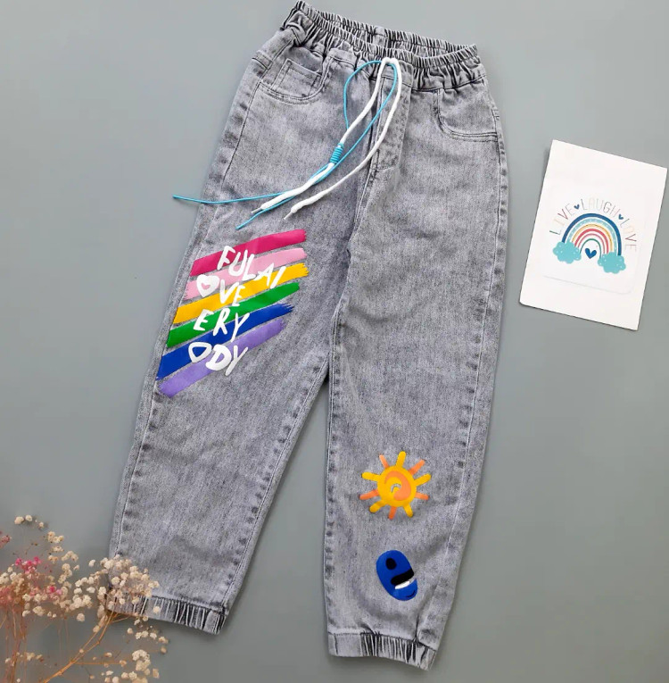 شلوار جین مام استایل پایین گتر طرح رنگین کمان